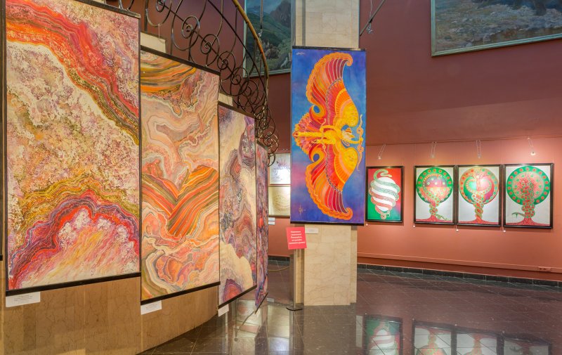 Зрителя выставки ждёт богатая галерея масштабных серий и композиций в стиле росписи по шёлку с философским наполнением и неожиданными трактовками общеизвестных явлений: узоров камней и бабочек, морских раковин и оперения птиц, растительной экзотики и явлений культуры.