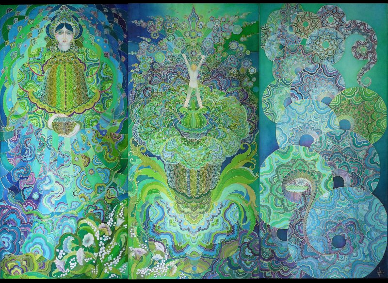 «Впечатление — образ — символ» — таков процесс осмысления природных и культурных реалий и творческое кредо автора — Анны Милосердовой», одного из ведущих мастеров в росписи по шелку, а также поэта и переводчика.